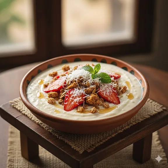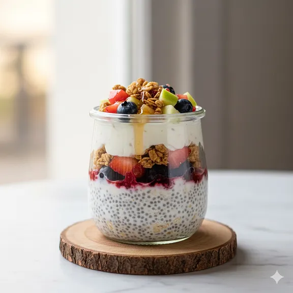 Avena reposada con chía servida con yoghurt griego, granola y fruta fresca