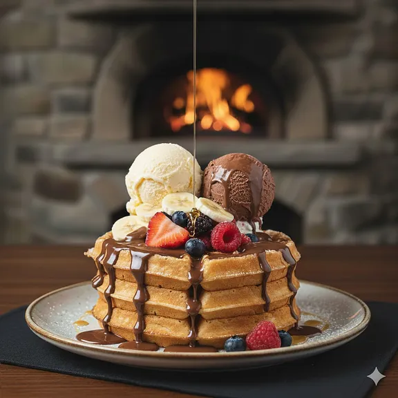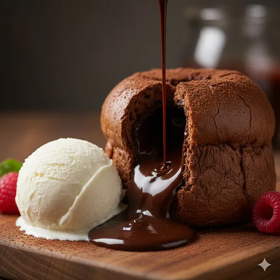 Pan de chocolate relleno de chocolate líquido combinado con una bola de helado de vainilla