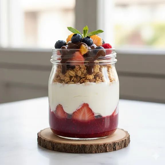 Yoghurt griego reposado en una cama de mermelada, acompañado de granola, un toque de chocolate y fruta fresca