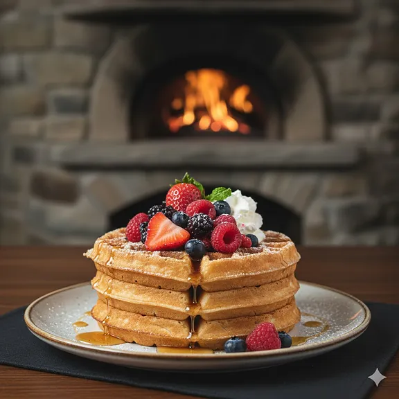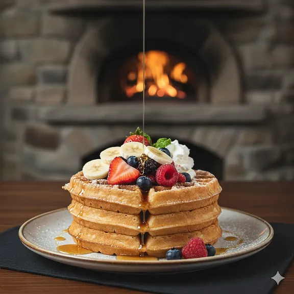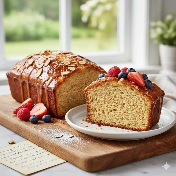 Nuestro pan de plátano tipo soufflé con una corteza caramelizada irresistible, acompañada de almendras y frutos rojos