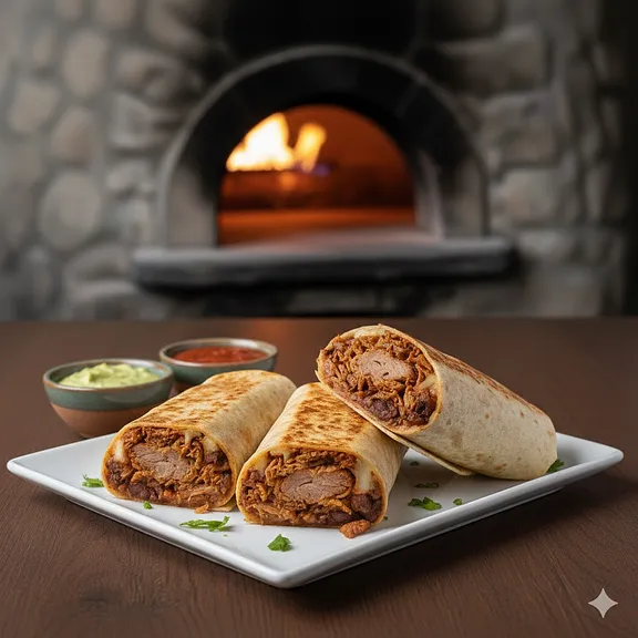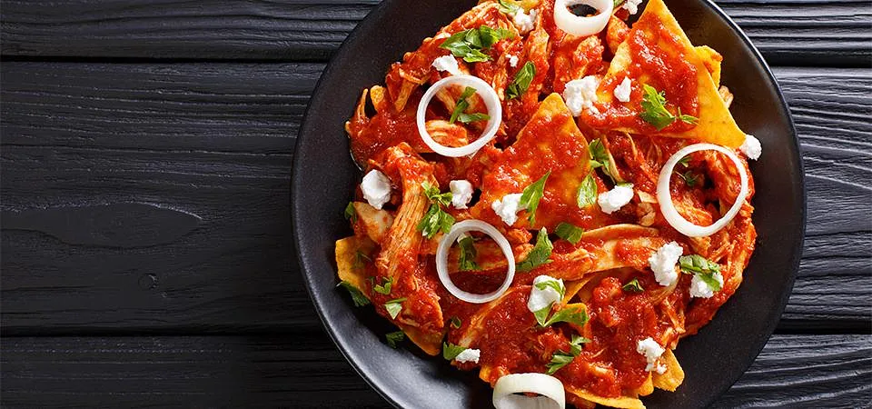Frijoles puercos, queso menonita, pollo marinado al pastor, cebolla y cilantro