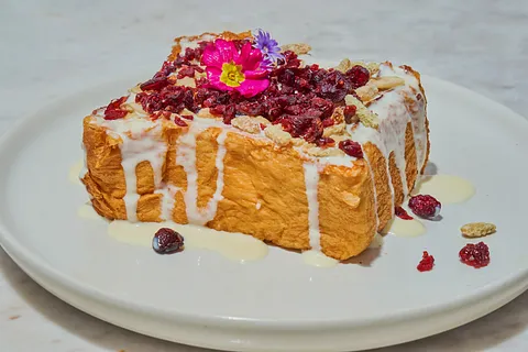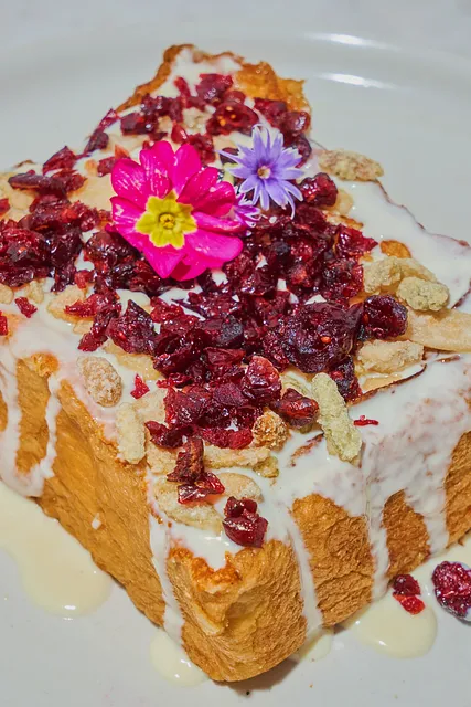 Pan brioche dorado en mantequilla, bañado en una salsa cremosa de chocolate blanco coronado con semillas caramelizadas y arándanos.
