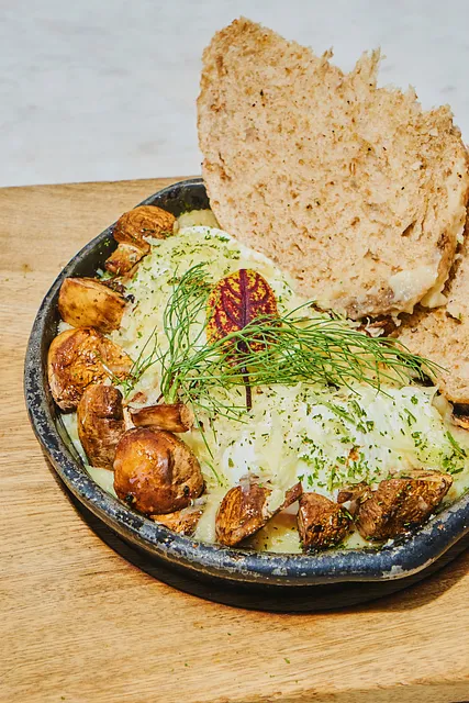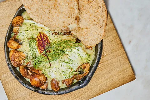 Dos Huevos pochados sobre una cama de puré de papa con champiñones salteados y queso parmesano.