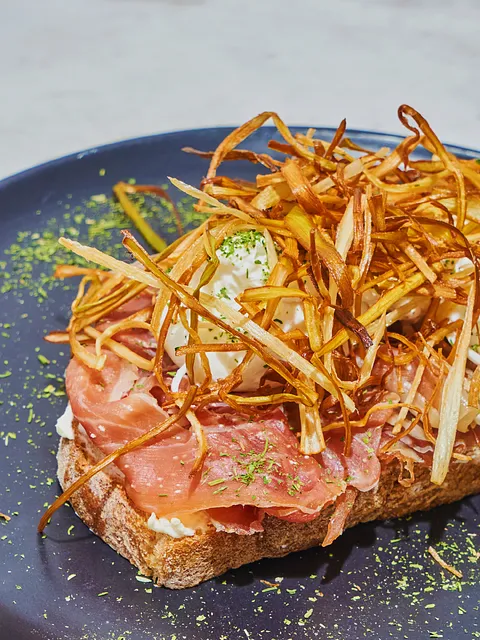 Pan de masa madre crujiente, untado con crema de limón, acompañada de jamón serrano, huevo pochado, coronado con poro y aguacate