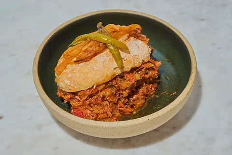 Barbacoa de marlin ahumado, acompañado de consomé, cebolla asada y coronado con chile toreado.