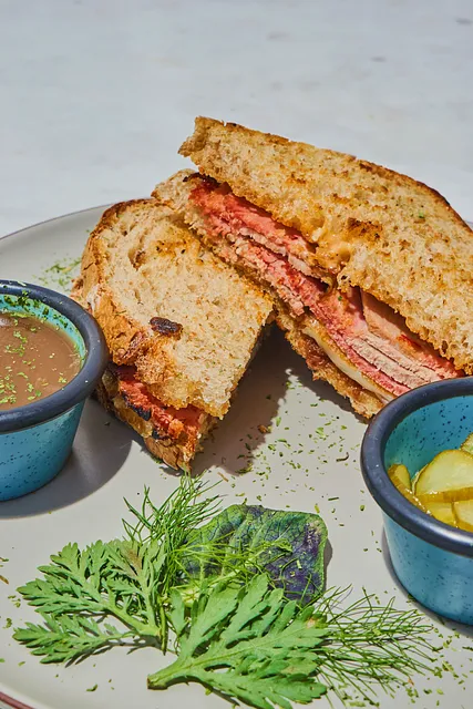 Roastbeef ahumado, jalea de tocino, alioli de chipotle, queso manchego. Acompañado de pepinillos y gravy.