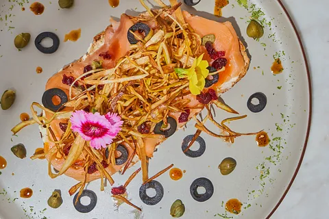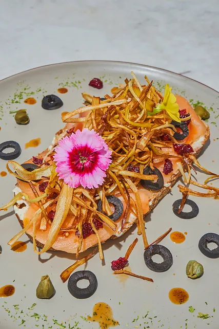 Pan de masa madre artesanal, untado con una crema de limón. Acompañada de salmón ahumado , decorada con alcaparras, aceituna negra y arándanos, coronada con poro frito y salsa macha