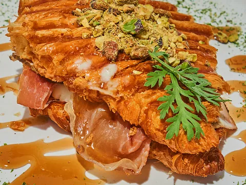 Croissant relleno de carnes frías y queso mozzarella fresco, coronado con maple y pistaches.