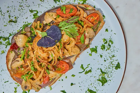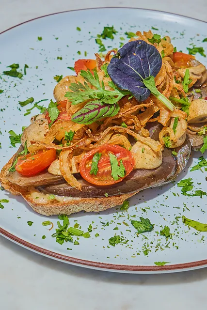 Hogaza de masa madre untada de salsa cremosa de la casa con berenjena asada, cebolla caramelizada, champiñones salteados, jitomate cherry asado.