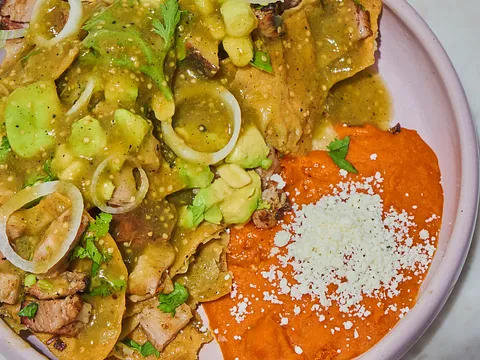 Chilaquiles bañados en salsa verde tatemada, acompañados de pancita ahumada, cebolla cambray y aguacate. Acompañado de frijoles refritos.