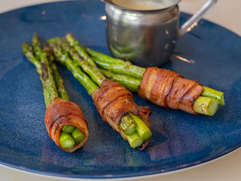 Tiernos espárragos envueltos en tocino acompañados de una cremosa salsa de cebolla.