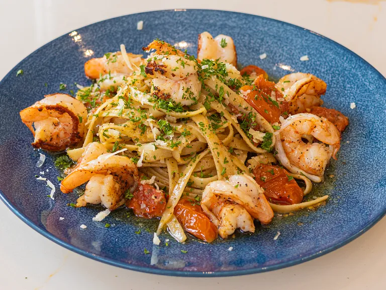 Pasta fetuccini, acompañada de una deliciosa salsa Pomodoro rústica, coronada con camarones ala mantequilla.