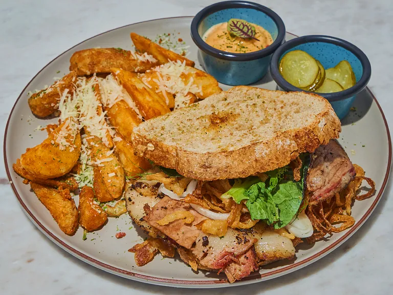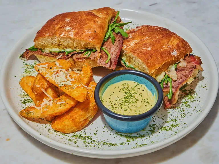Hogaza de masa madre relleno de brisket a cocción lenta, mayonesa chipotle y morrón escalfado. Topping de aguacate y cebolla caramelizada. Acompañado de papas gajo con queso parmesano.