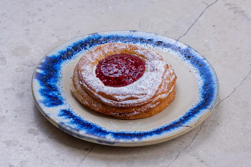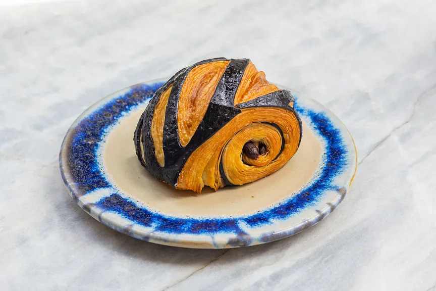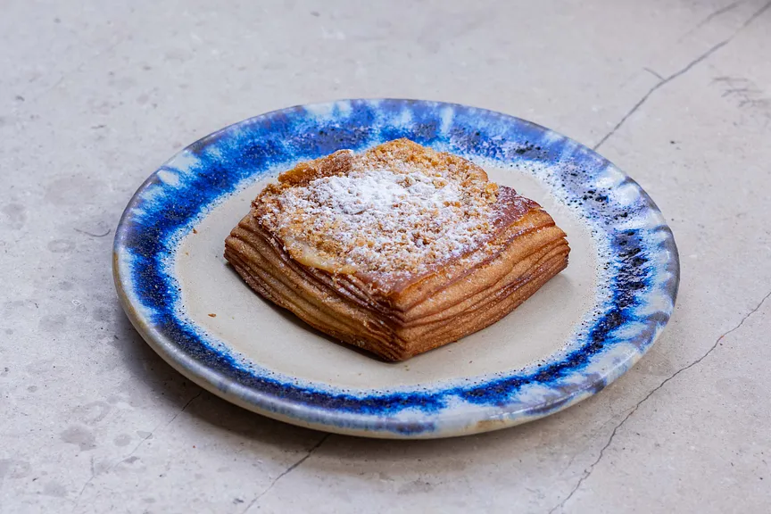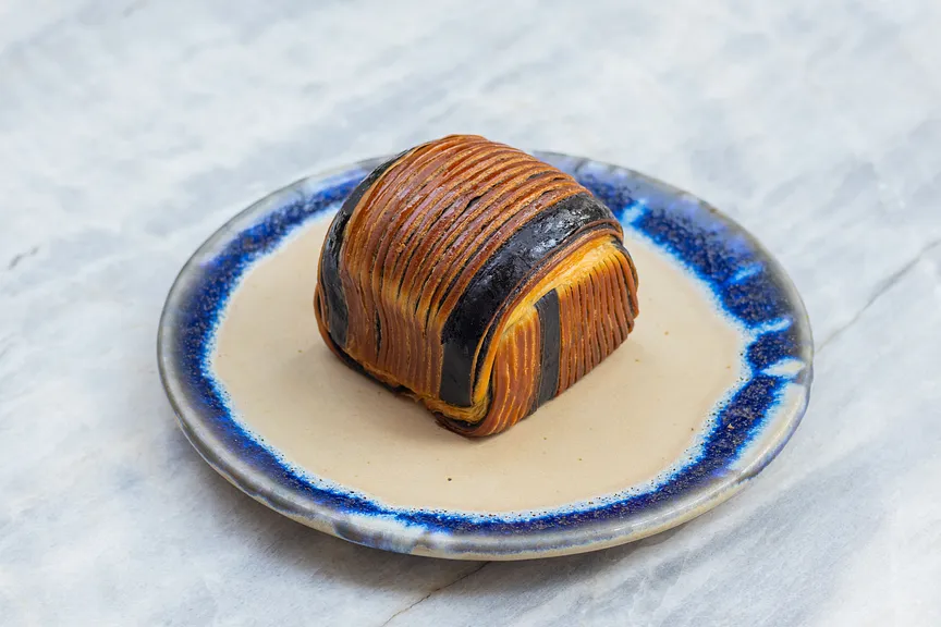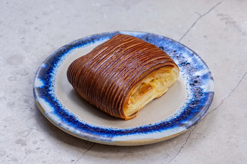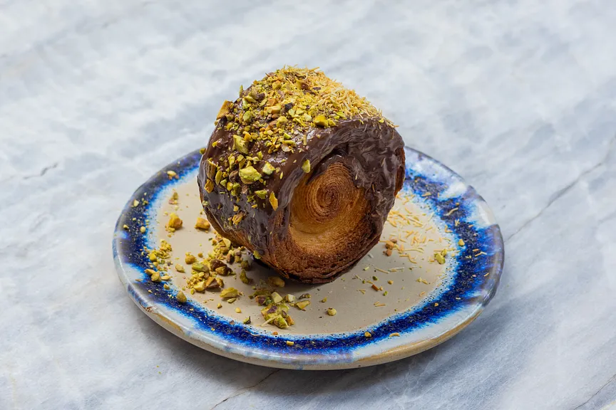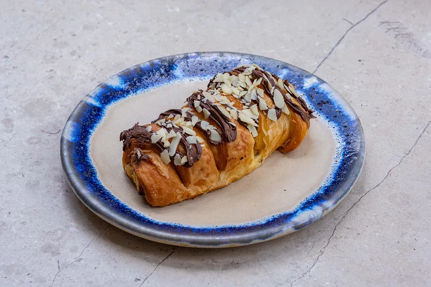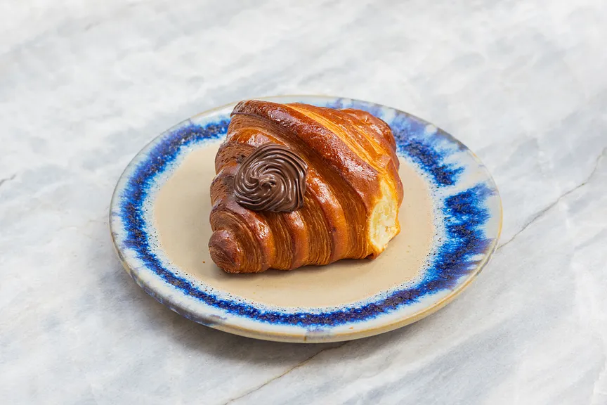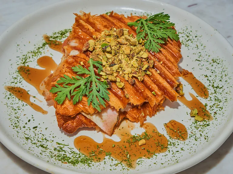 Croissant relleno de carnes frías y queso mozzarella fresco, coronado con maple y pistaches.
