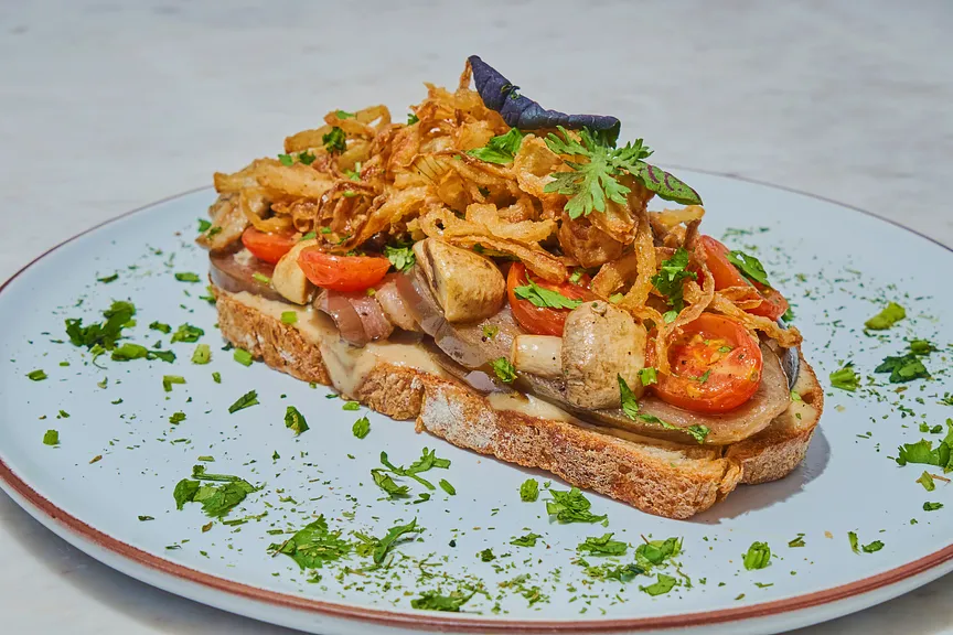 Hogaza de masa madre untada de salsa cremosa de la casa con berenjena asada, cebolla caramelizada, champiñones salteados, jitomate cherry asado.