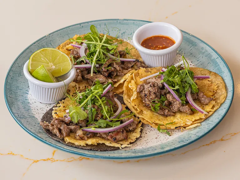Tortillas de maíz azul con costra de parmesano y rib eye acompañado de guacamole y cebolla guisada. (3 piezas)