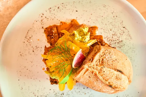 Birocho relleno de chicharrón guisado (100g), frijolitos, aguacate, cebolla encurtida y follaje