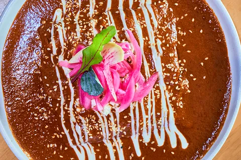 Rellenas de chicharrón prensado o pollo, bañadas en mole de la región occidente, ajonjolí tostado, crema, queso y encurtidos de la casa