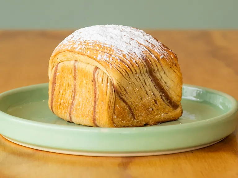 Suave y esponjoso croissant hecho de hojaldre laminado y cermosa mantequilla suiza.