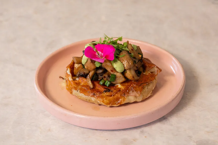 Pan de masa madre crujiente con un puré rústico de aguacate, coronado con huevos estrellados y queso de cabra cremoso. Acompañado de una ensalada fresca de lechuga sangría, espinacas y tomates cherry, con un toque ligero de reducción balsámica.