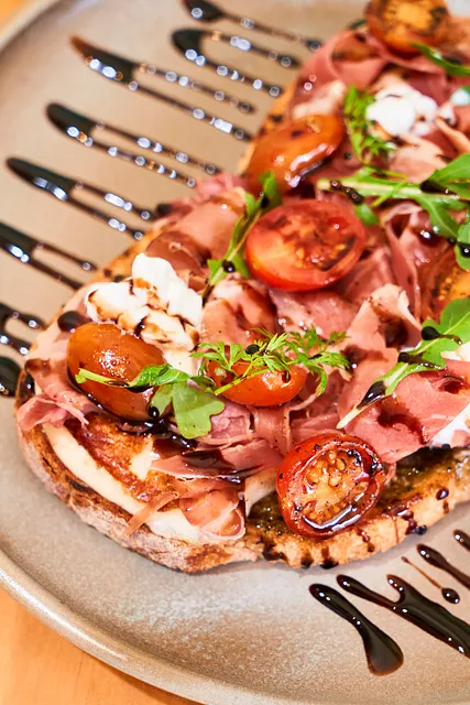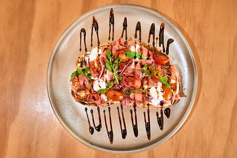 Crujiente toast con una base de pesto casero, queso mozzarella fresco fundido, jamón serrano, tomates cherry asados y un toque fresco de arúgula. Finalizada con cremoso queso cottage y un toque dulce de reducción de balsámico.
