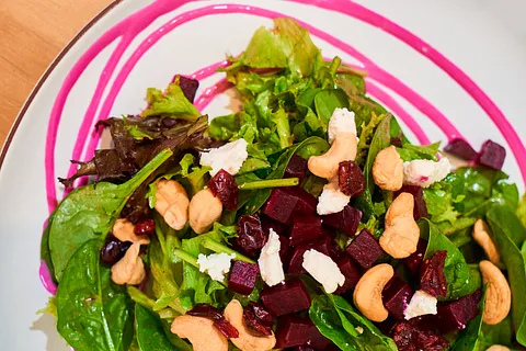 Betabel, nuez de la india y cebolla morada sobre una cama de espinaca, acompañados de un aderezo de serrano y un suave mousse de betabel.