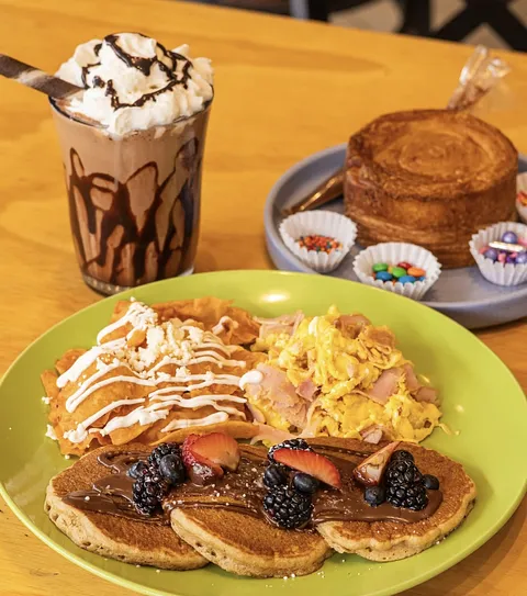 Huevo revuelto a elegir: natural, jamón o tocino. 3 piezas de mini hotcakes, coronados con berries y crema de avellana. Y una porción de chilaquiles rojos o verdes.
