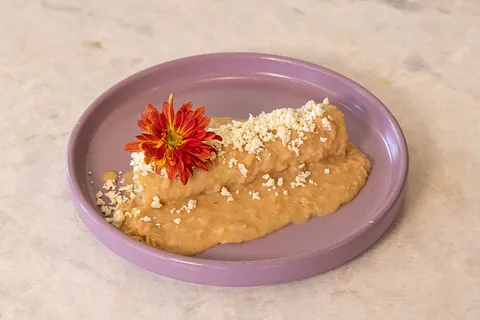 Tortilla de maíz rellena de queso o guiso a elegir, bañada en frijoles fritos. Queso y crema.