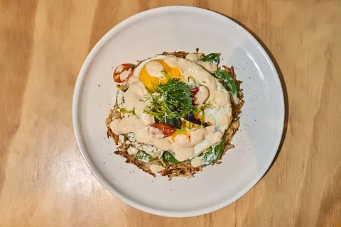 Huevos al gusto montados sobre una crujiente papa hash brown, acompañados de espinacas a la crema y finas hebras de espárrago fresco. Todo bañado en una salsa soubise cremosa, hecha con cebolla caramelizada, crema y un toque de pimienta negra.