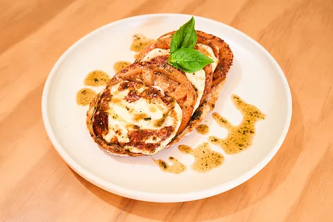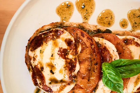 Pan de masa madre crujiente untado con nuestro pesto casero, cubierto con queso mozzarella fresco y hojas de albahaca fresca.