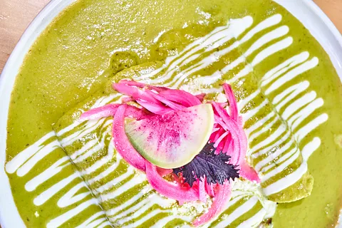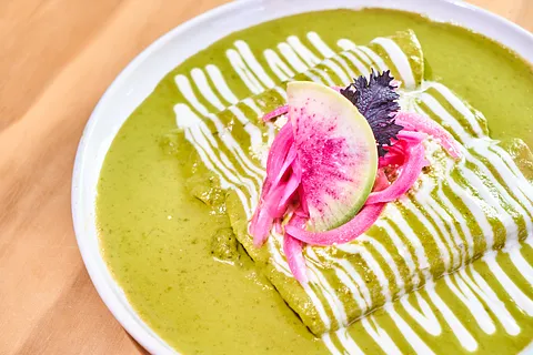 Crepas ligeras, rellenas de huitlacoche salteado con chile poblano, cubiertas con una cremosa salsa de poblano y crema fresca de rancho, queso desmoronado y cebolla encurtida.