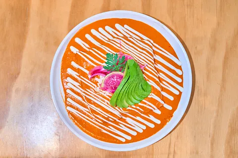 Tortillas de maíz rellenas de una combinación de flor de calabaza, queso panela y un mix de mexicano, bañadas en una salsa de jitomates rostizados con una textura cremosa. Se complementan con queso desmoronado, crema fresca de rancho, aguacate fresco y un delicado toque de cebolla encurtida.