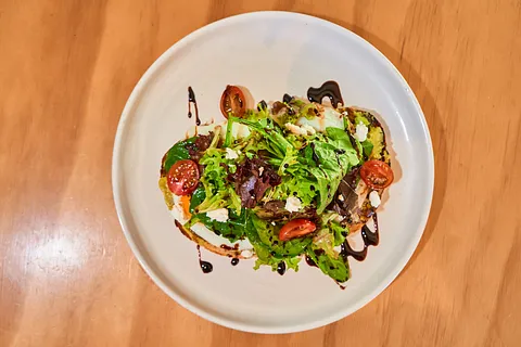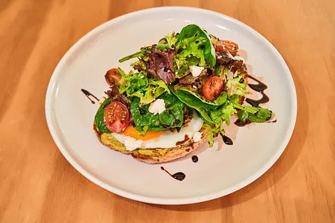 Pan de masa madre crujiente con un puré rústico de aguacate, coronado con huevos estrellados y queso de cabra cremoso. Acompañado de una ensalada fresca de lechuga sangría, espinacas y tomates cherry, con un toque ligero de reducción balsámica.