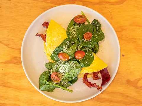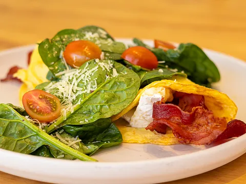 Un omelette esponjoso relleno de tocino dorado y crujiente, cremoso queso brie. Se acompaña de una ensalada fresca de espinacas con tomates cherry y un ligero toque de parmesano.