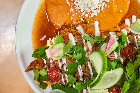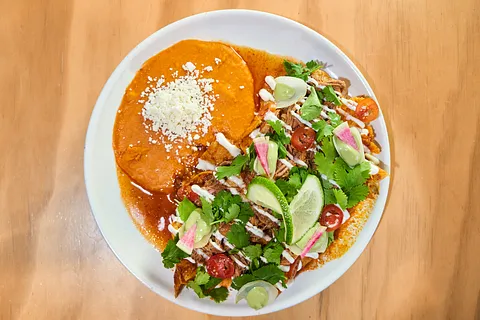 Crujientes chilaquiles bañados en salsa y coronados con una suculenta birria tatemada, con su toque ahumado y jugoso. Acompañados de mousse de aguacate suave, un toque de limón, cilantro fresco y cebollitas cambray asadas. Acompañados de frijoles refritos con queso.