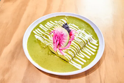 Crepas ligeras, rellenas de huitlacoche salteado con chile poblano, cubiertas con una cremosa salsa de poblano y crema fresca de rancho, queso desmoronado y cebolla encurtida.