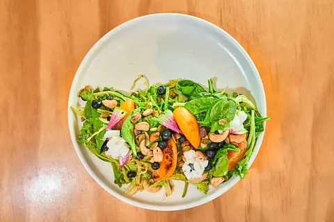 Una mezcla de lechuga sangría y espinaca baby con un aderezo de pistache, betabel, durazno flameado, pistache, pepitas de calabaza tostada y queso cottage para un toque cremoso.