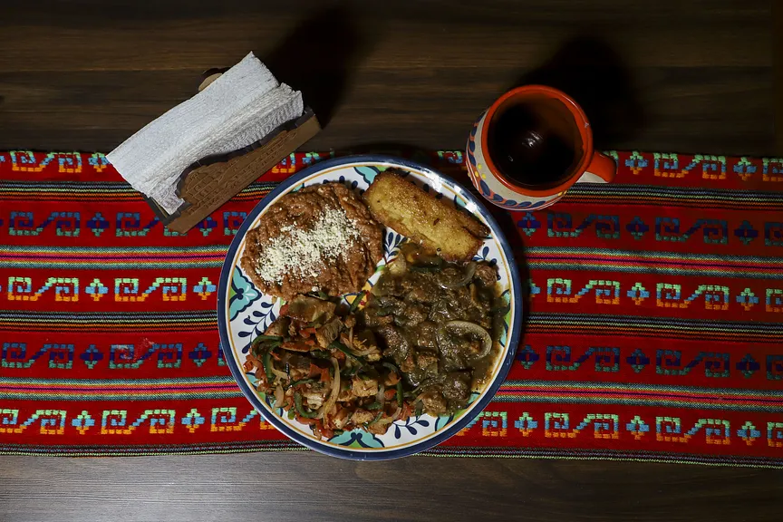 Carnitas a la mexicana, carne asada, tamal y frijol puerco.