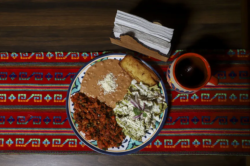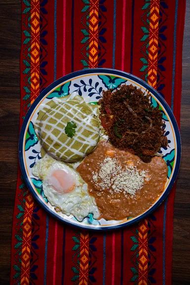Chilorio a la mexicana, chilaquil poblano, tamal y frijol puerco.