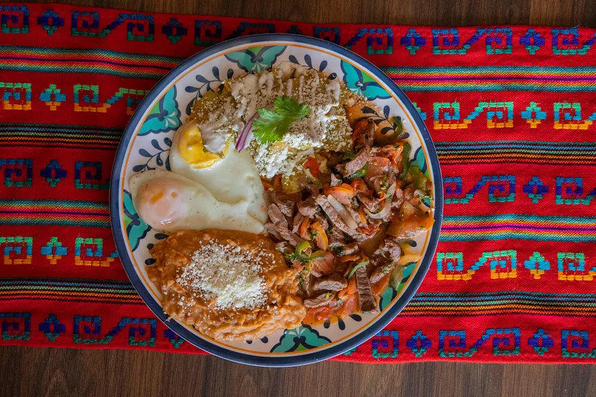 Bistec ranchero, chilaquil poblano, 2 piezas de huevos y frijol puerco.