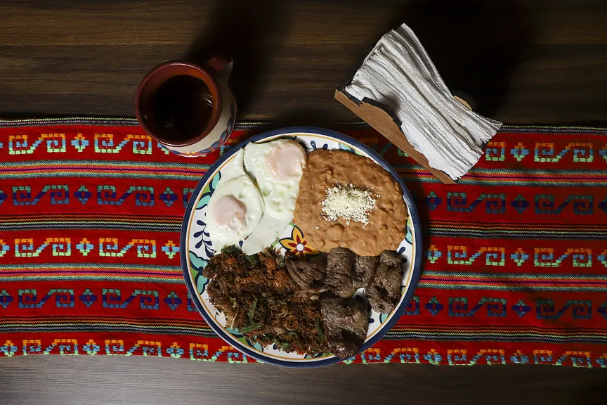 Carne asada, machaca, 2 piezas de huevo estrellado y frijol puerco.