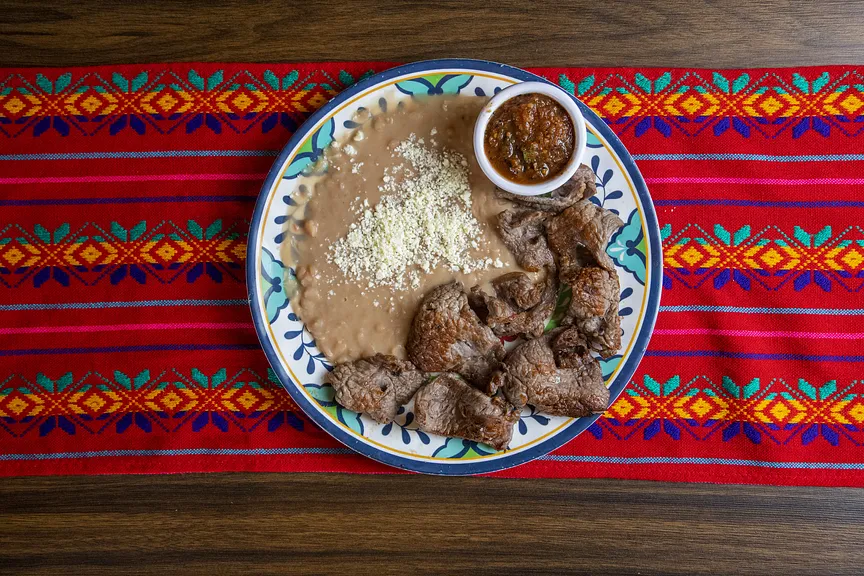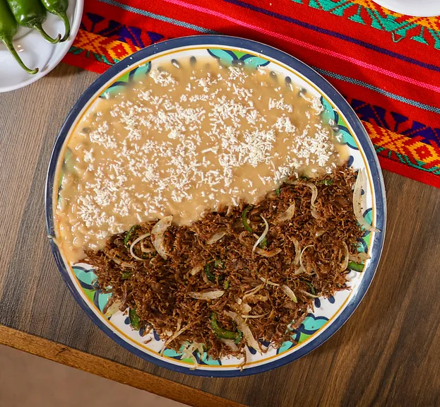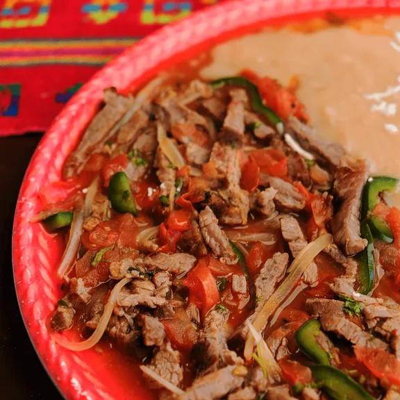 Especialidad de la casa. Carne 100% de res deshebrada y frita, guisado con tomate, cebolla y chile poblano. Toda una delicia