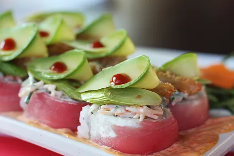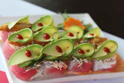 (5 Pzas) Envuelto en atún, camarón por dentro; coronado con Ensalada Kani, Esparrago Frito, Camarón Empanizado, Aguacate y un toque de Sriracha, sobre un espejo de mayo de masago.