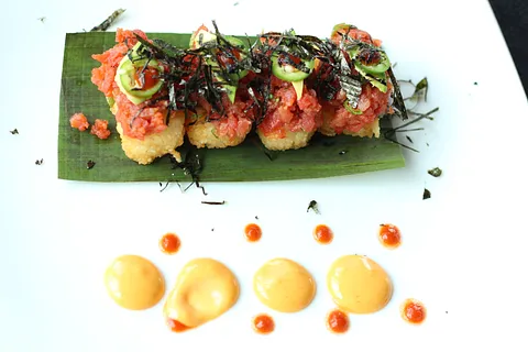 Cuadros de arroz frito, acompañados de atún spicy, laminas de aguacate, serrano y sriracha (4 pzas)