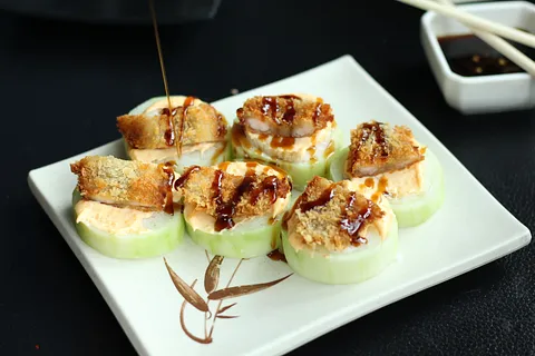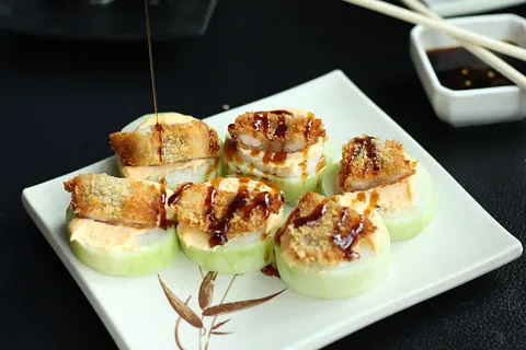 Rollo envuelto en pepino, con aderezo, camarón empanizado, Salsa de Anguila y ajonjolí