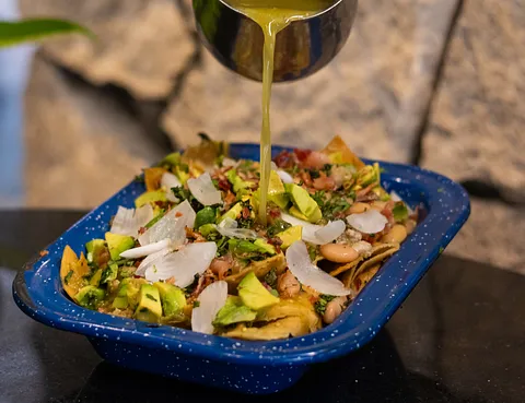 Totopos crujientes con tradicional carne en su jugo tapatía. Con crema y queso fresco. Acompañados de frijoles refritos.