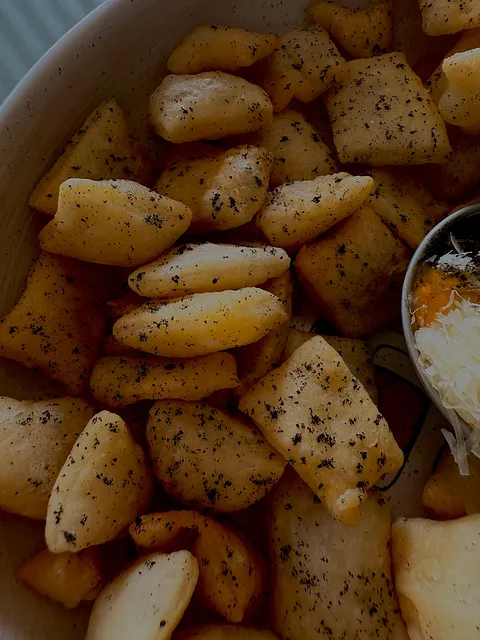 Acompañada de una crema ácida de parmesano, miel y cenizas de chile.