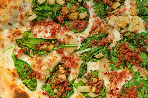 Salsiccia italiana, papa al ajo, espinaca, chile de árbol y mozzarella.