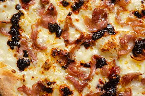 Jamón serrano, miel, recado negro (mole maya de chiles quemados) y mozzarella.