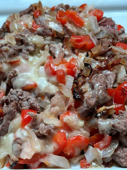 200 gramos de bistec con tocino, chorizo, morrón, jitomate y cebolla